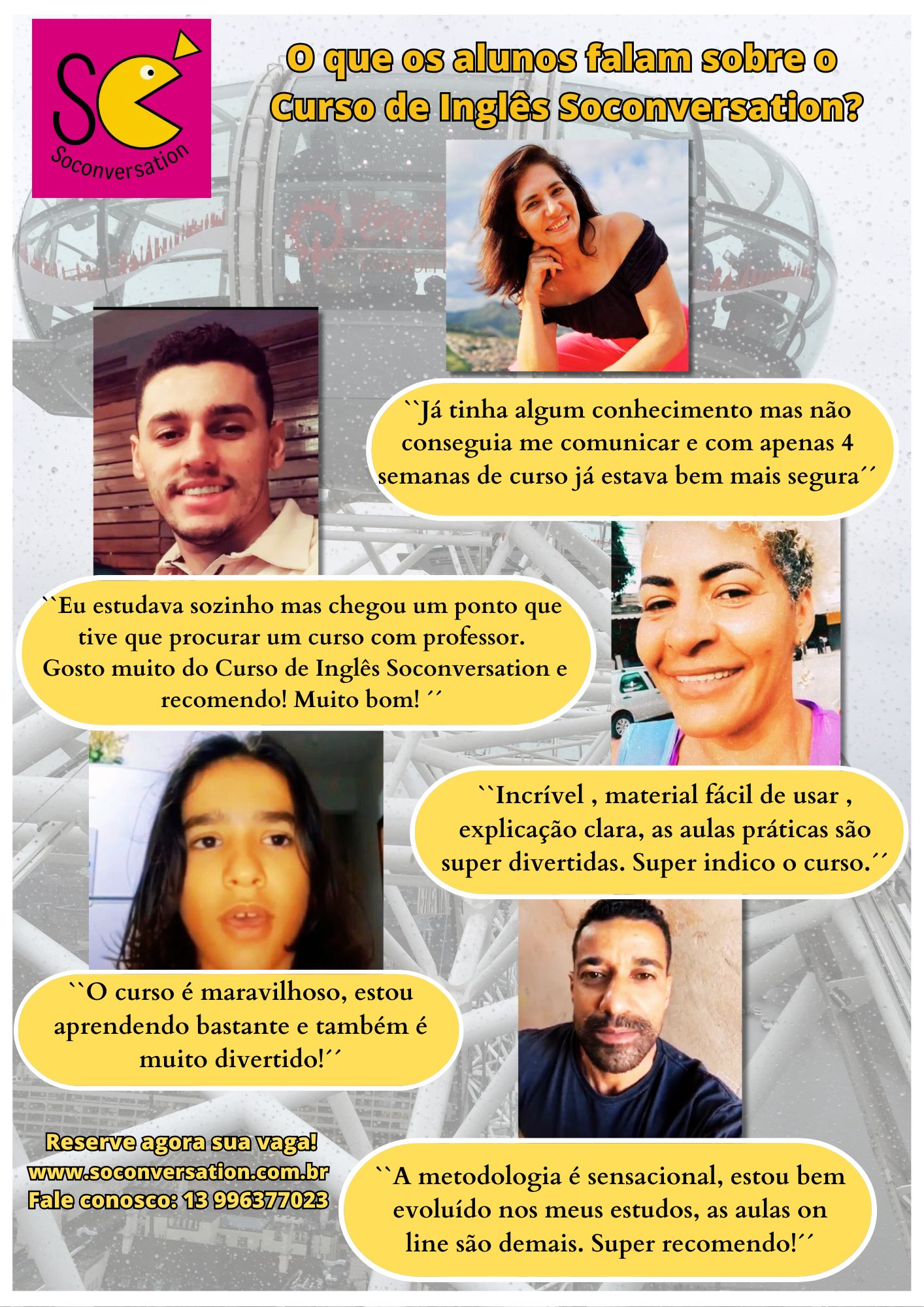 Além disso, oferecemos o Soconchat, um Encontro semanal de bate-papo ao vivo online, onde os alunos têm a oportunidade de interagir diretamente em inglês, aprimorando suas habilidades de conversação e ganhando confiança gradualmente. Através desse processo contínuo de aprendizado e prática, a fluência na língua inglesa se desenvolve de maneira orgânica e natural.