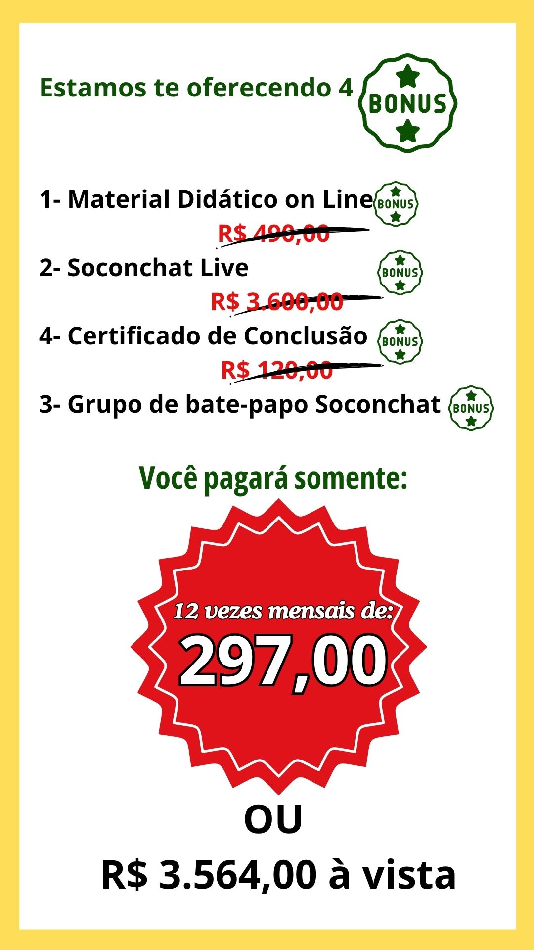 A Mentoria de Inglês SoconversationNível Básico em Grupo segue o Método de ensino da Universidade de Oxford e oferece uma nova abordagem para aprender inglês, a qual se concentra no que realmente importa: Na Conversação. Outro fator importante é que te ajudamos a perder a timidez de falar inglês, o que atrapalha muito no desenvolvimento do aluno ao longo do curso se não for trabalhado da forma correta. Por isso acreditamos que a chave para aprender inglês mais rápido é começar da forma correta: Conversando!. Assista a esse VÍDEO
